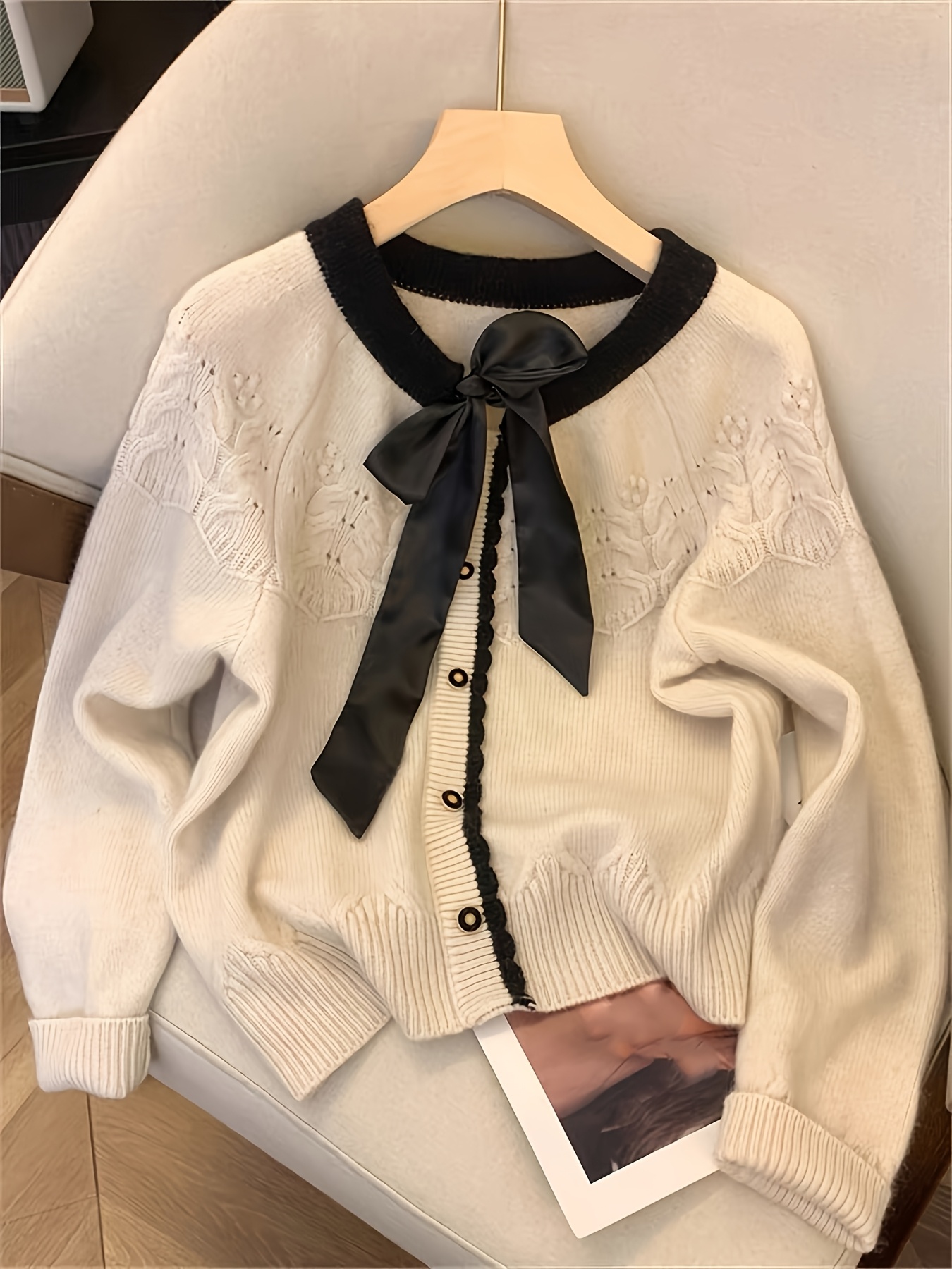 Elegant French-Style Color Block Long Sleeve Sweater with Bow Tie Detail, Round Neck, Button Front, Ribbed Cuffs - Perfect for Spring/Summer/Fall/Winter Outings and Valentine'S Day, Cute Sweaters