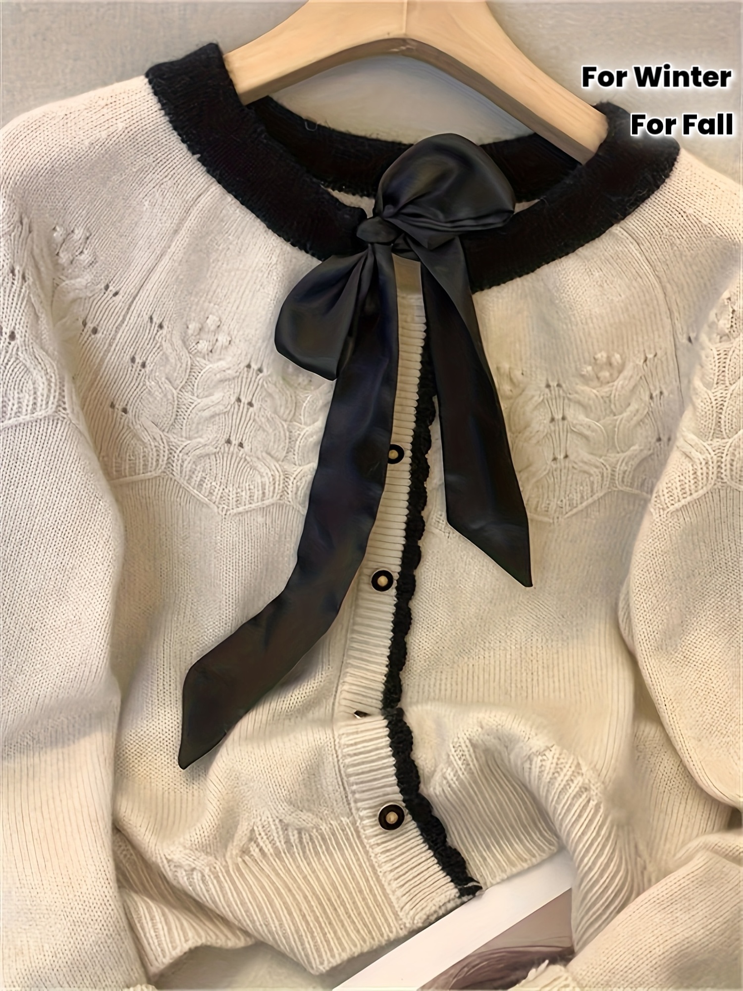 Elegant French-Style Color Block Long Sleeve Sweater with Bow Tie Detail, Round Neck, Button Front, Ribbed Cuffs - Perfect for Spring/Summer/Fall/Winter Outings and Valentine'S Day, Cute Sweaters
