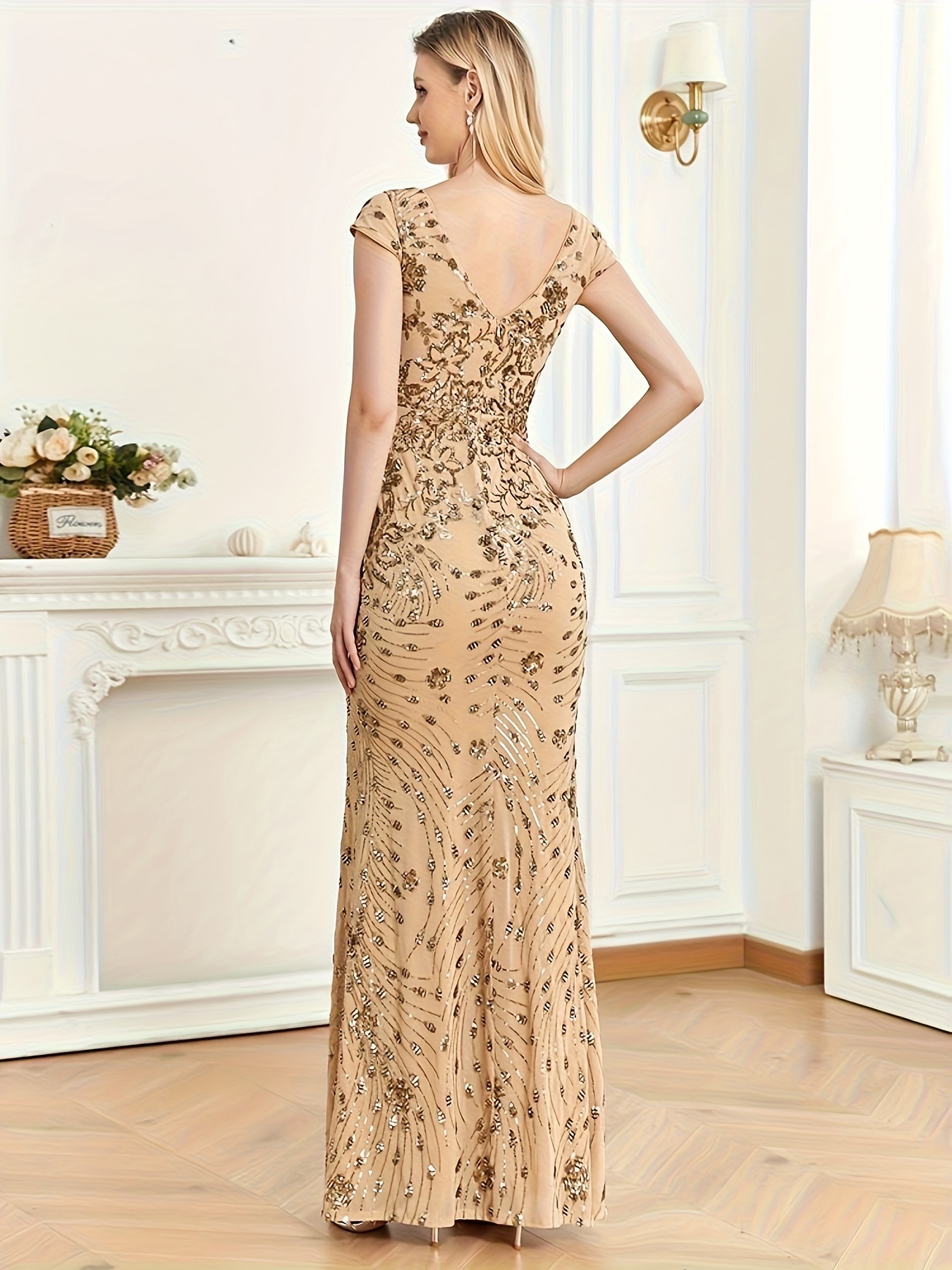 New European and Middle Eastern Style Sequined Champagne Evening Dress, Sexy Slim-Fit Mermaid Long Gown for Women